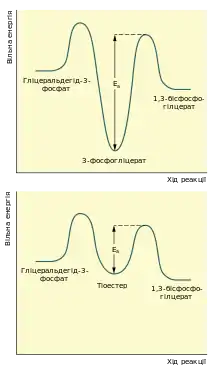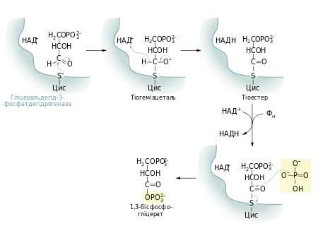 Реакцію перетворення гліцеральдегід-3-фосфату до 1,3-бісфосфогліцерату можна розглядати як два окремі процеси: окиснення альдегідної групи НАД+ та приєднання фосфатної групи до утвореної карбонової кислоти. Перша реакція термодинамічно вигідна (ΔG0 = −50 кДж/моль), друга, навпаки, невигідна. Зміна вільної енергії для другої реакції майже така сама, тільки ця зміна додатна. Якби вони відбувались послідовно одна за одною, то друга реакція вимагала б надто великої енергії активації, щоб перебігати в клітині з достатньою швидкістю. Але обидва процеси є спряженими тому, що проміжна сполука — 3-фосфогліцерат — ковалентно зв'язана із залишком цистеїну тіоестерним зв'язком в активному центрі ферменту. Такий тип зв'язку дозволяє «законсервувати» частину енергії, яка виділяється під час окиснення гліцеральдегід-3-фосфату, та використати її для реакції із ортофосфатною кислотою[27].