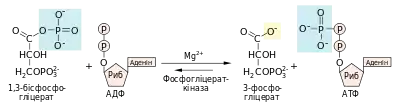 У наступній реакції великий запас енергії ацилфосфату використовується для синтезу АТФ. Ферменти фосфогліцераткіназа 1-го та 2-го типу (назва від зворотної реакції) каталізують перенесення фосфатної групи із 1,3-бісфосфогліцерату на АДФ з утворенням АТФ та 3-фосфогліцерату[28].