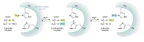 Початкове фосфорилювання фосфогліцератмутази здійснюється реакцією із 2,3-бісфосфогліцерату, незначної концентрації якого достатньо для активації ферменту[28].