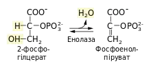 Наступна реакція — утворення енолу в результаті дегідратації (відщеплення води) 2-фосфогліцерату — веде до утворення фосфоенолпірувату (скорочено ФЕП). Процес каталізує фермент енолаза.