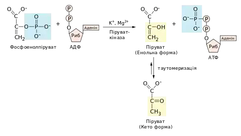 Останню реакція гліколізу — перенесення фосфатної групи з фосфоенолпірувату на АДФ — каталізує піруваткіназа за наявності іонів K+ та Mg2+ або Mn2+. Продуктом цієї реакції є піруват, який спочатку утворюється в енольній формі, після чого швидко й неферментативно таутомеризується в кетонну форму[31].