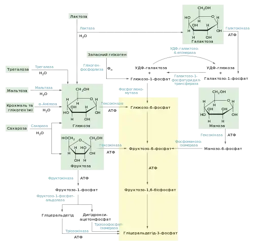 Окрім глюкози у процесі гліколізу зазнають перетворень ще чимало вуглеводів. Найважливішими з них є полісахариди крохмаль та глікоген, дисахариди сахароза, лактоза, мальтоза та трегалоза, а також моносахариди — фруктоза, галактоза та маноза[36].