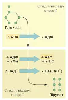 На першій стадії відбувається фосфорилювання глюкози у шостому положенні, ізомеризація одержаного глюкозо-6-фосфату до фруктозо-6-фосфату та повторне фосфорилювання вже у першому положенні. Внаслідок цього утворюється фруктозо-1,6-бісфосфат. Фосфатні групи на моносахариди переносяться з АТФ. Це необхідно для активації молекул — збільшення вмісту в них вільної енергії[17]. Потім фруктозо-1,6-бісфосфат розщеплюється до двох фосфотріоз, які можуть вільно перетворюватись одна на одну.
