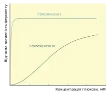 - має низьку спорідненість до глюкози, константа Міхаеліса становить 10 мілімоль/л, що перевищує нормальний вміст глюкози в крові;