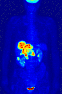 У деяких випадках підвищена інтенсивність гліколізу може бути застосована для виявлення пухлини за допомогою позитрон-емісійної томографії (ПЕТ). Пацієнту в кров вводять аналог глюкози 2-флюоро-2-дезоксиглюкозу (ФдГ), мічений ізотопом 18F. Ця речовина поглинається клітинами і є субстратом для першого ферменту гліколізу — гексокінази, проте не може бути перетворена фосфоглюкоізомеразою, тому накопичується в цитоплазмі. Швидкість накопичення залежить від інтенсивності захоплення аналога глюкози та його фосфорилювання. Обидва процеси значно швидше відбуваються в ракових клітинах, ніж у здорових. При розпаді 18F виділяються позитрони, які фіксуються спеціальними сенсорами[54].