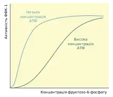 - АТФ, АДФ, АМФ. АТФ є не тільки субстратом, а й інгібітором для ФФК-1. Коли споживання цієї молекули відбувається повільніше, ніж її синтез, вона приєднується до алостеричного центру ферменту і знижує спорідненість ФФК-1 до фруктозо-6-фосфату. Концентрація АДФ та АМФ підвищується у разі інтенсивного використання АТФ. Вони діють як активатори, послаблюючи вплив АТФ на ФФК-1. У такий спосіб регулюється активність фосфофруктокінази в усіх тканинах[48].
