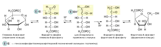У другій реакції гліколізу відбувається ізомеризація глюкозо-6-фосфату до фруктозо-6-фосфату під впливом ферменту глюкозофосфатізомерази (гексозофосфатізомерази). Спочатку відбувається відкриття шестичленного піранозного кільця глюкозо-6-фосфату, тобто перехід цієї речовини у лінійну форму, після чого карбонільна група з першого положення переноситься в друге через проміжну ендіольну форму[18]. Тобто альдоза перетворюється на кетозу. Утворена лінійна молекула фруктозо-6-фосфату замикається у п'ятичленне фуранозне кільце[20].