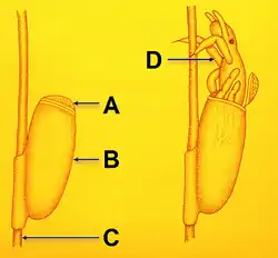 Будова гниди: A — кришечка, B — оболонка, C — волосся, D — вилуплювання личинки
