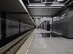 Станція має яскравий сучасний дизайн, в якому основна роль відводиться концепції освітлення. Базовим кольором для станції обраний чорний, крім того, будуть використані жовтий, білий та фіолетовий відтінки[4]. Точково світяться чорні колони, де світло заховано за перфорованими кам'яними плитами. Отвори в плитах закрито скляними вставками. Колони підсвічуються зсередини, а на їхній поверхні є малюнок у вигляді світних крапель[5]. Платформа оброблена сірим гранітом, стеля — чорна, дзеркальна, з малюнком у вигляді лабіринту з люмінесцентних ламп[1][4].