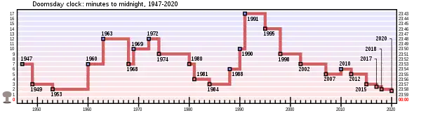 - 23 січня 2020 року годинник переведено на 20 секунд вперед (час 23:58:20) через призупинення дії Договору про ліквідацію ракет середньої та малої дальності, збільшення протистояння між США та Іраном та через кліматичну небезпеку.[6]