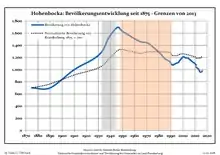 Динаміка населення з 1875 року в сучасних кордонах (Синя лінія: населення; Пунктир: відносна порівняльна динаміка населення землі Бранденбург; Сірий фон: період Третього рейху; Помаранчевий фон: період НДР)