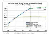 Динаміка населення з 1875 року в сучасних кордонах (Синя лінія: населення; Пунктир: відносна порівняльна динаміка населення землі Бранденбург; Сірий фон: період Третього рейху; Помаранчевий фон: період НДР)