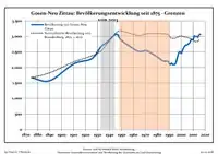 Динаміка населення з 1875 року в сучасних кордонах (Синя лінія: населення; Пунктир: відносна порівняльна динаміка населення землі Бранденбург; Сірий фон: період Третього рейху; Помаранчевий фон: період НДР)