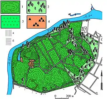 На парковий тип садово-паркового ландшафту, у жому також найбільшу цінність становлять ділянки вікових дубів звичайних, припадає 14,5 % від озелененої площі урочища. Частину насаджень лісового типу садово-паркового ландшафту слід переводити у парковий. Найбільший інтерес при цьому являють перехідні ділянки, їх сумарна площа становить близько 6,4 га. Але існує тенденція захоплення цих територій бузиною чорною.