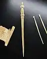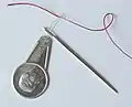 Швацька голка — тонкий металевий стрижень з гострим кінцем і вушком, у яке всилюється нитка для шиття[11].