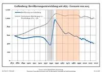 Динаміка населення з 1875 року в сучасних кордонах (Синя лінія: населення; Пунктир: відносна порівняльна динаміка населення землі Бранденбург; Сірий фон: період Третього рейху; Помаранчевий фон: період НДР)