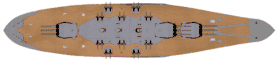 Ілюстрована анімація корабельної артилерії американського лінкора «Вашингтон» типу «Норт Керолайна», що складалася з дев'яти 406-мм гармат головного калібру (Mark 7 16"/50, виділені червоним кольором) та двадцяти 127-мм гармат допоміжного калібру (Mark 12 5"/38, виділені синім кольором
