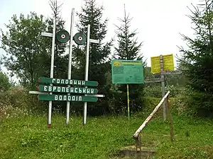 Оновлений знак у місці, де проходить Головний європейський вододіл (с. Дубровиця на Львівщині, 2012 р.)