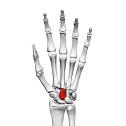 ![]() Ліва рука спереду (з боку долоні). Головчаста кістка виділена червоним. | |