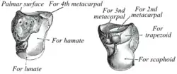 ![]() Ліва головчаста кістка. Ліворуч: ліктьова поверхня (з боку мізинця). Праворуч: променева поверхня (з боку великого пальця) | |