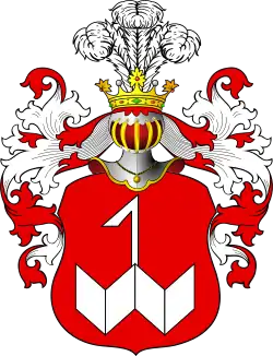 «На червоному полі — основна фігура герба, виконана в білому кольорі — на фігуру, яка схожа на „дубль В“, зверху накладено гак (стріла) з одним краєм. Над щитом шолом, прикрашений княжої короною, на клейноди шолома та ж основна фігура.