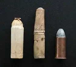 Гільза патрона — паперова (1,5 оберти), з підклеєним картонним денцем — кружечком; маса порохового заряду становила 4,8 грама — відносний заряд 1:6,4. Перед зарядом знаходились папковий шпігель (піддон кулі) з основою ударної суміші позаду і гніздом для яйцеподібної кулі попереду.