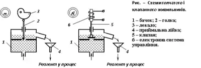 Голчатий живильник АПІ-1 та клапанний живильник ПРІ-1 (рис. ) — для дозування чистих реагентів або розчинів (напр., ксантогенатів, сірчистого натрію та ін.). У живильниках цих типів реагент вводиться у ємність 1 знизу, а зливний отвір розташований у верхній частині корпуса.