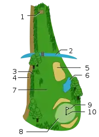 У гольф грають на спеціально підготовленій трасі зазвичай із дев'ятьма або вісімнадцятьма лунками. Кожна з лунок оточена майданчиком із рівно та коротко підстриженою травою — гріном. До гріну від стартового майданчика веде смуга дещо вищої рівної трави — фервей. Обабіч фервею — ще вище підстрижена трава — раф, за яким зовсім непідстрижена трава, кущі, дерева, водойми. По боках фервею між стартовим майданчиком та грінами встановлюються кілька штучних перешкод — бункерів, доволі глибоких ям із піском.