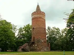 Замок було споруджено на насипі висотою 3 м. Спершу він складався з валів та мурованого будинку. У 1406—1418 роках територію замку було розширено, що надало комплексу вигляд чотирикутника розмірами 40 × 40 м. Тоді було розібрано старіші будівлі. Новий замок розмірами 12 × 25 м розташовувався біля південного оборонного муру. Південно-східний кут займала відокремлена циліндрична вежа заввишки близько 24 метрів. Її цоколь на плані, подібному до квадрата (8,5 × 9 м), був побудований у нижній частині з ератичних валунів, а вище з — цегли. У підземеллі знаходилася в'язниця. Вхід до вежі був розміщений на висоті близько 6 метрів над рівнем подвір’я. На подвір'ї також знаходилися господарські споруди, ймовірно, більш пізнього періоду, у тому числі пивоварня зі сходу, пекарня та надбрамний будинок із півночі.