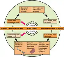 Два гомеостатичних механізми, що працюють через ПТГ, з одного боку, і кальцитонін, з іншого, можуть дуже швидко виправити будь-яку навислу помилку в рівні іонізованого кальцію в плазмі, або видаляючи кальцій з крові та відкладаючи його в скелеті, або видаляючи кальцій з нього. Кістяк діє як надзвичайно великий запас кальцію (близько 1 кг) порівняно з запасом кальцію у плазмі (близько 180 мг). Довгострокова регуляція відбувається завдяки всмоктуванню або вивільнення кальцію з кишківника.