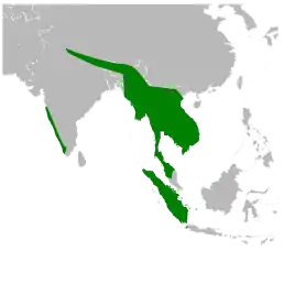 Широко поширений від Індії до Південно-Східної Азії і далі через Малаккський півострів до острова Суматра. Трапляється в лісистій місцевості.