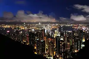 ![]() Вид з гори Вікторія, дивлячись на північ над Центральною, гавань Вікторія та Коулун вночі (2011). |