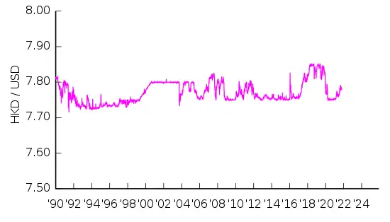 З 1983 року валютний курс гонконзького долара є прив'язаним до американського долара у співвідношенні 7,75-7,85 HKD за один USD. Станом на 18 лютого 2022, валютний курс гонконзького долара (за даними МВФ, ЄЦБ та НБУ) становить 7,8 гонконзьких доларів за 1 долар США (0,1282 долара США за 1 гонконзький долар), 8,856 гонконзьких доларів за 1 євро (0,1129 євро за 1 гонконзький долар) та 0,2751 гонконзького долара за 1 гривню (3,636 гривень за 1 гонконзький долар).