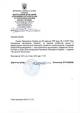 - Указ Президента України «Про відзначення державними нагородами України» № 1118/99 (Архівна довідка ЦДАВО України)