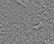 Приблизно з північного сходу на південний захід щит перетинає ряд деталей із ознаками западання поверхні.[8] Ці деталі на щиті поєднуються між собою лінією невеличких щитових вулканів на дні кальдери. Цілком ймовірно, що ця лінія репрезентує значний підземний розлом, подібний до тих, які були виявлені в інших місцях регіону Tharsis. Цей розлом може бути джерелом тієї лави, яка живила вулкан Arsia Mons в минулому.