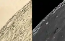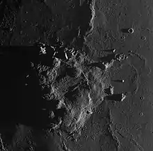 - На Місяці є й кілька більших височин вулканічного походження, але вони менш компактні й зі слабше вираженими межами (наприклад, височина в Океані Бур, на якій стоять пагорби Маріуса) або й гіпотетичні через погану збереженість (наприклад, вулкан біля кратера Гарднер на півночі Моря Спокою)[9][10][11].