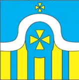 Квадратне полотнище; на синьому тлі біла підкова шипами донизу, у якій жовтий лапчастий хрест, супроводжувана вгорі меншим жовтим лапчастим хрестом, внизу — п'ятьма жовтими нитяними стовпами, вершини яких утворюють півколо дугою донизу.