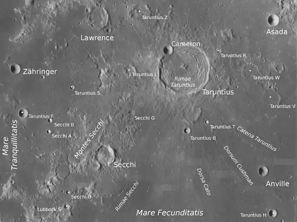 Біля північно-східного кінця гір Секкі знаходиться 57-кілометровий кратер Тарунцій. Дещо південніше цих гір Море Достатку перетинають борозни Секкі (лат. Rimae Secchi).