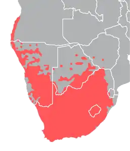 Вид поширений в Південній Африці — на південному заході Анголи, в Намібії, Ботсвані, ПАР, Лесото, на заході Есватіні та на півдні Зімбабве. Населяє напівсухі савани, торнвельд та світлі ліси, сільськогосподарські угіддя, міста та села.