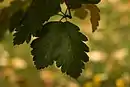 Листопадні дерева з листками 6-12 см в довжину, еліптичної або довгасто-яйцеподібної форми, тупі, з округлою основою, біля основи частіше з 5 парами неглибоких, але чітко визначених, загострених або тупих лопатей, іноді нижні пари листочків розсічені майже до середньої жилки, але ніколи не є складними і перистими, у верхній частині пластинка листа невиражено і неглибоко лопатево-зубчаста, по краю листя дрібно і нерівномірно пильчато-зубчасті, з 7-9 парами жилок, зверху з восковим нальотом, темно-зелені, блискучі, знизу до осені шерстисті, сіруваті або жовтувато-сірі від опущення, перед листопадом фарбуються в жовтий або помаранчевий колір.