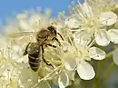 Квітки білі, до 1,2 см в діаметрі, з неприємним запахом, зібрані в широкі, повстяні-опущені щитки до 15 см в діаметрі. Цвітіння в кінці травня — початку червня (після розпускання листя). Плоди 1,3 см в діаметрі, еліпсоїдні до довгастих, цегляно-червоного кольору, їстівні тільки після впливу високих температур, які руйнують отруйні речовини, що знаходяться в плодах. Дозрівають в серпні-вересні.