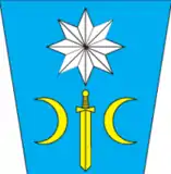 На синьому квадратному полі біла гранована восьмипроменева зірка, під якою жовтий меч вістрям донизу, який супроводжується з обох боків жовтими півмісяцями, повернутими ріжками в протилежні боки. Від однієї шостої нижнього краю до верху древкової частини і від п'яти шостих нижнього краю до верху вільної частини йдуть білі трикутні смуги.