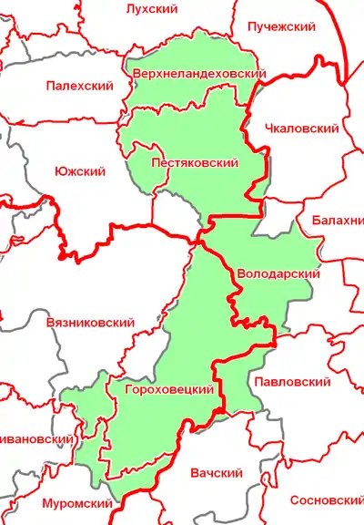 Розміщувався на частині територій сучасних Гороховецького, В'язниковського та Муромського районів Владимирської області, Пестяковського та Верхньоландеховського районів Івановської області, Володарського та Павловського районів Нижньогородської області.