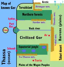 Планета Гор має слабшу за земну силу тяжіння, що дозволяє існувати величезним птахам і будувати міста з високих башт, які неможливі на Землі. Навколо планети обертаються три природні супутники. Відома географія Гора складається переважно з західного узбережжя континенту, яке пролягає від Арктичної Півночі на південь екватора з Океаном Тасса на заході, і гірським ланцюгом Волта, який формує східний кордон у багатьох широтах. Так само існують острови, розташовані в океані далеко від берега і кілька рівнин на сході від Волта.