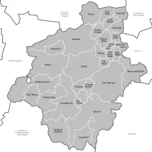 Район складається з 5 міст і 11 самостійних громад (нім. Gemeinden), а також 31 громади, об'єднаної в 4 об'єднання громад (нім. Verwaltungsgemeinschaften).