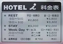 «Готелі кохання» можуть бути позначатися на вході символами сердець і пропозицією «відпочинку» (англ. rest, яп. 休憩, «кюкей»), причому як на термін 1-4 годин, так і на цілу ніч[2]. Розцінки у денний час зазвичай дешевші. Бронювання місць не передбачено, тимчасово залишати найнятий номер теж не дозволено. Ці місця можуть також використовуватися повіями для побачень з клієнтом, а також як звичайні готельні номери.