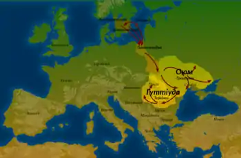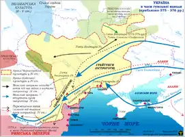 Під тиском гунів король вестготів Фрітигерн (Fritigern) 376 року попросив у імператора Східного Риму Валента дозвіл поселитися зі своїми підданими на південному березі Дунаю. Валент дозволив і допоміг готам перетнути річку (ймовірно, біля фортеці Дуросторум (Durostorum)). Незабаром внаслідок голоду почалась Готська війна (377–382), під час якої Валента було вбито в битві під Адріанополем (Adrianople) 9 серпня 378 р.