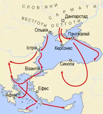 З 255 року готи рушають в морські походи, спочатку в східній частині Чорного моря, пограбувавши разом із боранами 256 року міста Пітиус (Піцунда) і Трапезунд. 257 року готи вперше перетнули Босфор, захопивши декілька міст в Малій Азії. Друга хвиля вторгнень готів почалася в 263 році, коли готи, за підтримки герулів, перетинають Дарданелли, та грабують Пелопоннес та Візантію 267 року. 268 року вони зазнали нищівної поразки від військ Клавдія II в битві при Найсусі (Naissus) (Ніш, Сербія) і були витиснені за Дунай 271 року. Його наступник, Авреліан, розбиває готів, цим самим на деякий час стабілізуючи ситуацію на Дунаї. Готи оселяються на північ від Дунаю, де створили незалежне королівство у щойно покинутій римлянами провінції Дакія.