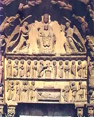 Собор у Шартрі. Портали західного фасаду. Близько 1145 – 1170 рр. Складна скульптурна композиція включала статуї юдейських царів і цариць (з боків порталів), сцени з життя Христа (на капітелях), «Вознесіння Богоматері», «Христа у Славі» із символами чотирьох євангелістів і Богоматір із Дитятком (на тимпанах). Критики цього розкішного оздоблення церкви вважали, що церква має повернутися до ідеалів бідності.