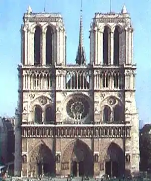 Собор Паризької Богоматері. Західний фасад. Початок будівництва близько 1120 р. Типова для готичної архітектури схильність до складних будівель і розкоші знаходить підтвердження в появі трьох прикрашених скульптурою порталів головного фасаду.